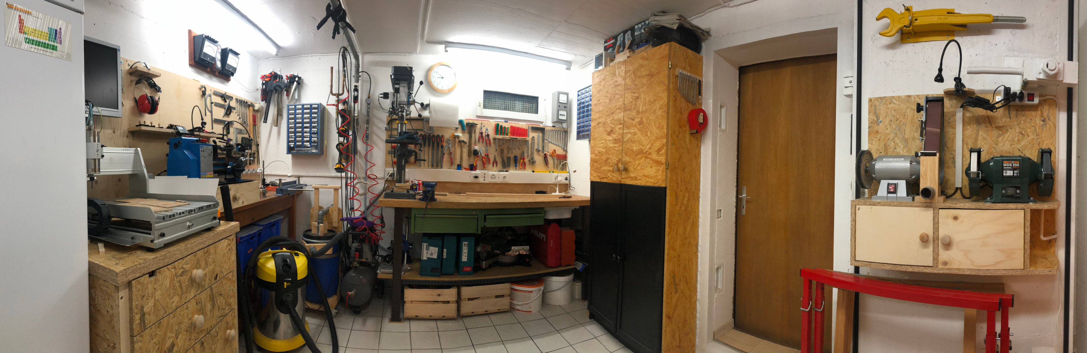A lab is not a workshop: you cannot do mechanics in the same place you do electronics: metal shavings are not good for circuits. So I set up a small workshop in the basement with some basic tools: a sturdy workbench, a vise, a drill press, a sheet metal brake, a mini-lathe, a CNC router, a shop vac, a cyclone sawdust collector and a couple of bench grinders. It's a compromise for the space available, but more than enough for some fun with mechanics and woodworking. Of course, there is also a small compressor and the home-brew steam whistle on the wall...
