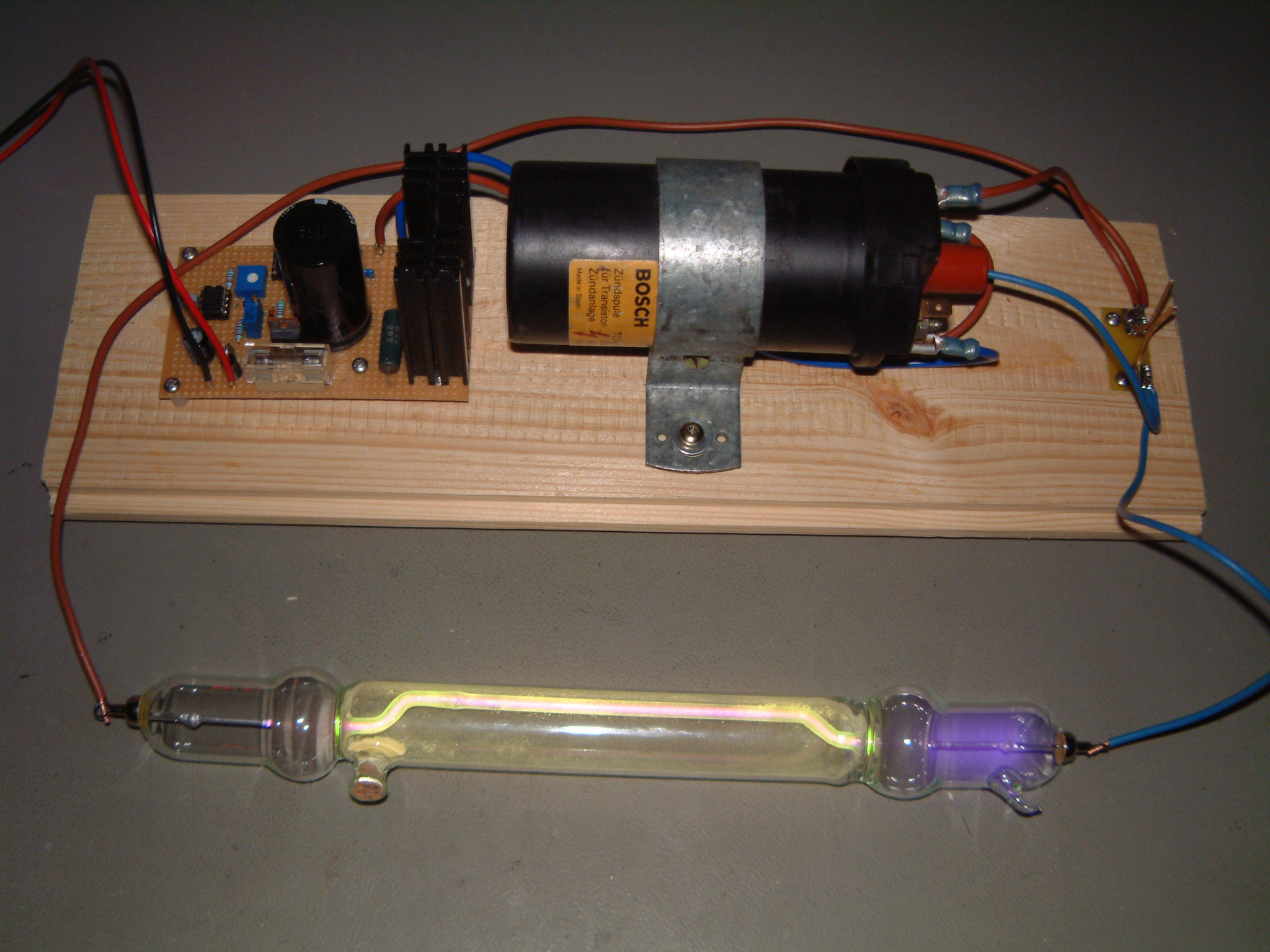 High voltage power supply with a modern Geissler tube (click to enlarge).