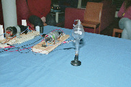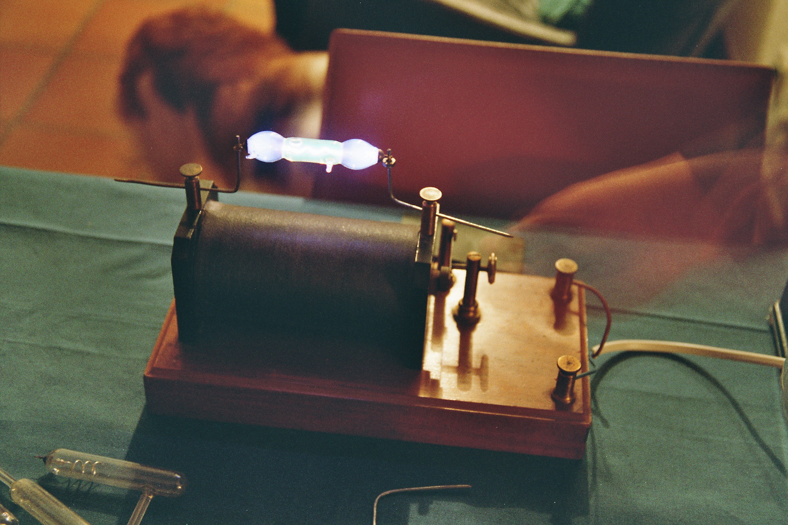 Finally a view of all the equipment used. All the Geissler tubes are in the middle: they are all one century old except the straight yellow one on the right which we bought new for testing. Than, the original Ruhmkorff coil is in the top middle part of the picture while the new high voltage generator is on the left. On the top a very crude 12 V power supply. Almost all the tubes worked except one that didn't strike.