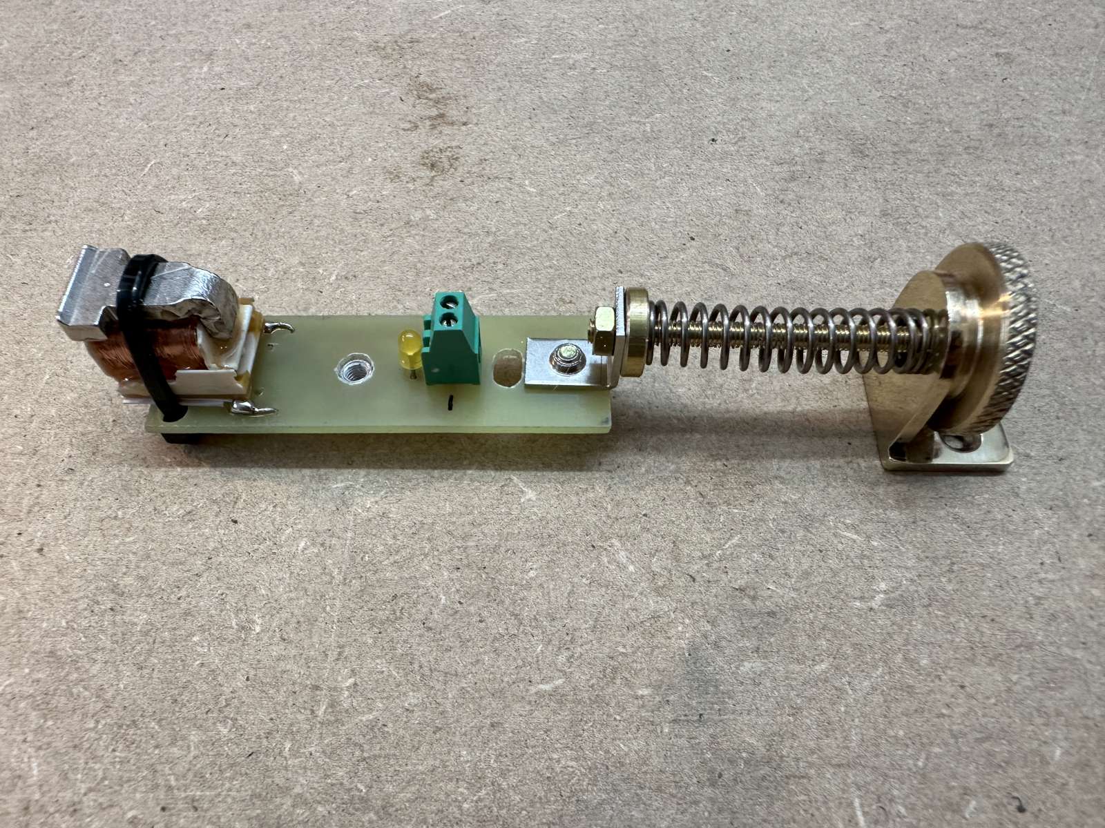 The electromagnet on his support PCB, the LED and the fine-pitch screw to adjust its position. (click to enlarge)