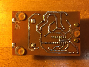 The picture below shows the result of the etching process: a nice and shiny PCB ready to be drilled and cut to size.