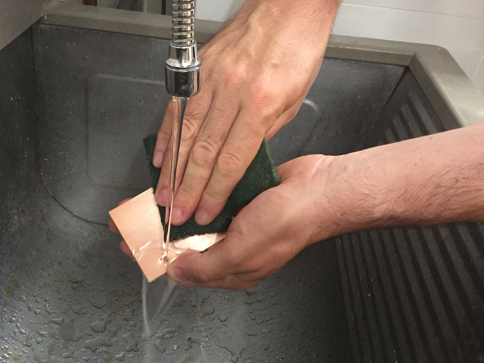 Wash it, let it dry and inspect the result. You will notice, as it dries, that some paper fibers are still stuck to the toner and it becomes light gray instead of black: this is ok as long as the toner is uniform and there are no fibers between the tracks. Remember not to touch the copper with your fingers.