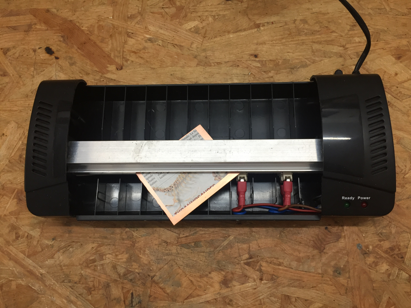 I modified my laminating machine by replacing the thermal switches to increase its temperature. Still, it's still a bit on the cold side and I need a flatiron anyway. To prevent it from overheating, I cut off the top part of the cover. This also allows better handling of the PCB.
