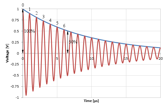 As you can see, the amplitude of the signals halves in about 2.5 cycles and we can easily calculate the Q-factor by multiplying by 4.53 and we find Q = 11.3.
